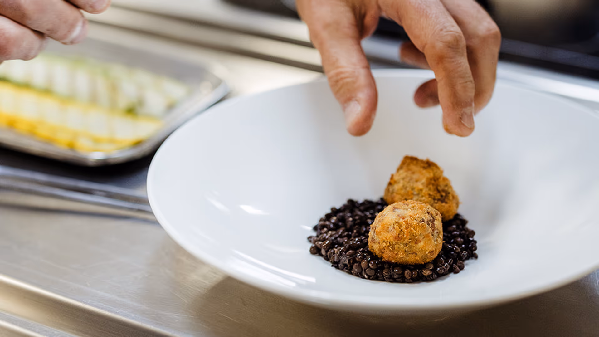 Plaats de drie truffel Brisotto balletjes prominent op het bord en werk af met de witte wijn-vadouvan saus. Druppel of nappeer de saus rondom zodat elke hap de versterkte truffelsmaak meeneemt. Een gerecht dat raffinement en aardse smaken perfect combineert.