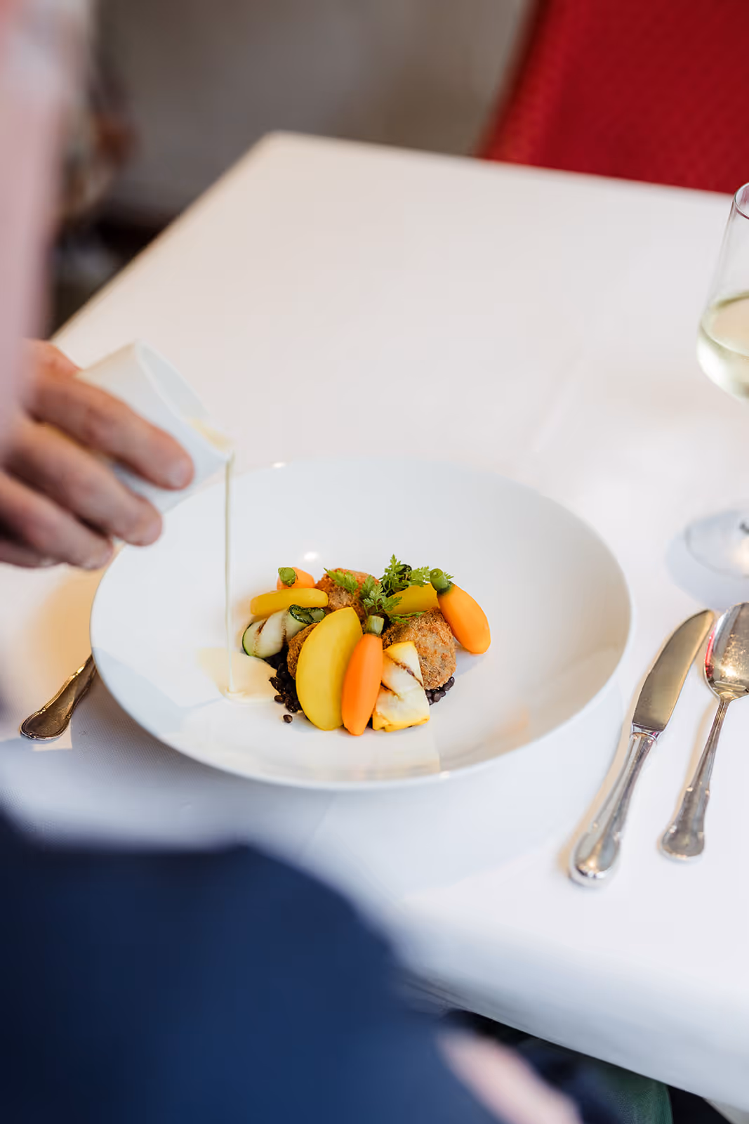 Een elegant vegetarisch gerecht waar truffel centraal staat. Drie knapperige truffel Brisotto balletjes geserveerd op een bed van zachte linzen, omringd door kleurrijk getourneerde groenten. De witte wijn-vadouvan saus versterkt de truffelaroma's en bindt alle smaken samen tot een verfijnd geheel.